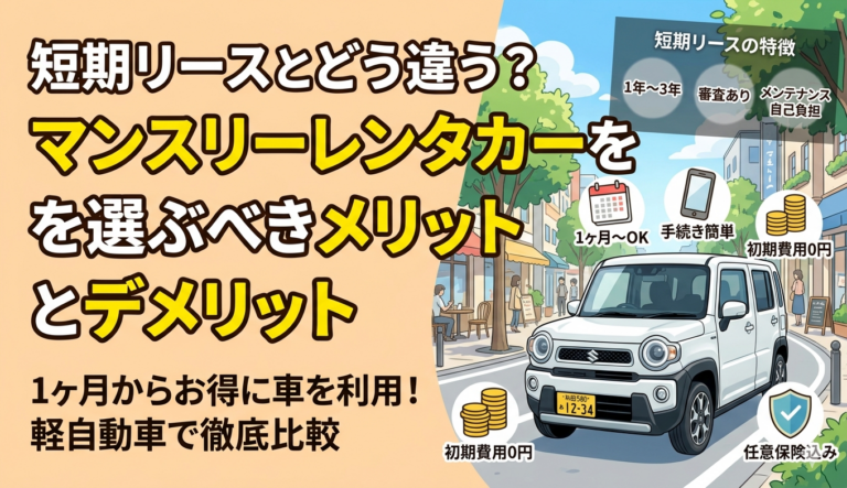 短期リースとどう違う?マンスリーレンタカーを選ぶメリット・デメリット【グッドバリューレンタカー南アルプス】 2026年4月6日 南アルプス市で「数ヶ月だけ車が必要」という方が増えています。転勤・出張・納車待ち・期間限定の通勤や送迎など、ずっと所有するほどではないけれど、しばらくの間は車が必要になる場